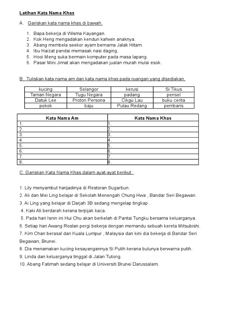 Latihan Kata Nama Am Dan Khas Tahun 4 - Latihan Tatabahasa Kata Nama Khas Tahun 2 Nama Latihan